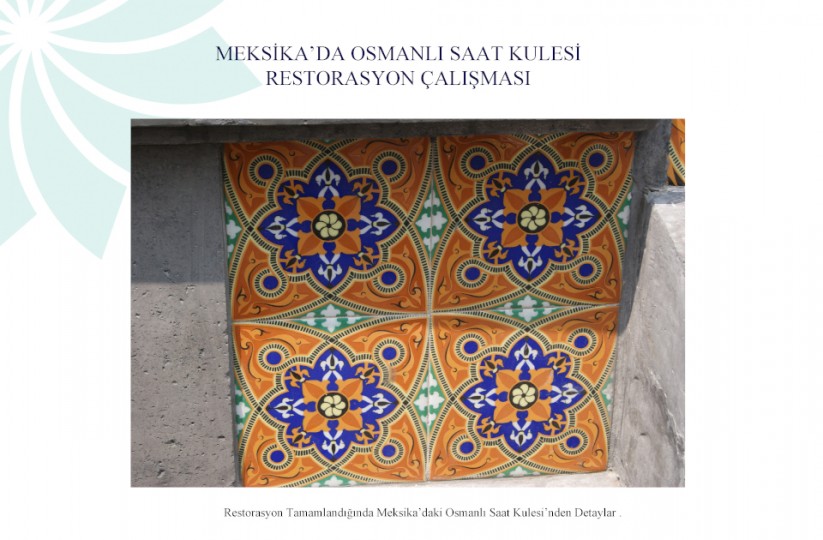 The tower shares the same design with the tiles in Horhor Fountain in Üsküdar, Istanbul. On the top of the tower, there is a plate with the writing “La Colonia Otomana a Mexico-Septiembre de 1910” (From the Ottoman Society to Mexico - September 1910).