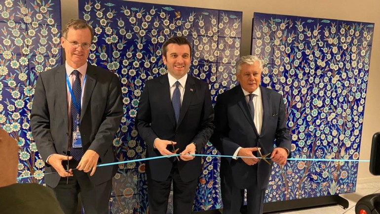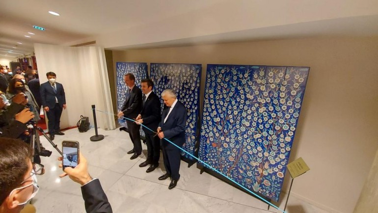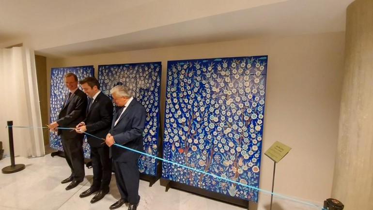 Dünyanın en önemli sivil toplum kuruluşlarından Unesco’nun Paris Merkez Binası için 630cm x 240cm boyutlarında hazırlanan pano vakfın İznik’teki atölyelerinde, tamamen el işçiliğiyle üretildi. 30cm x 30cm ebatındaki 168 karodan oluşan, 15 m2’nin üzerindeki pano için hazırlanan tasarımda klasik çini sanatının tüm öğelerine yer verildi. İznik Çinileri’nin en önemli özelliği olan “geometri ile nesnelerin dengeli uyumu” panoda dikkat çekmekle beraber; geleneksel çini desenlerinde yer alan flora görüntüsü mavi ve kırmızı tonlarının ağırlığında tasarıma yansır. İznik Çini sanatında 540 farklı formda kullanılan lale motiferi de panoda göze çarpmaktadır.