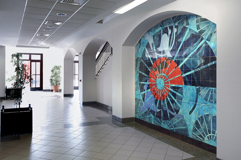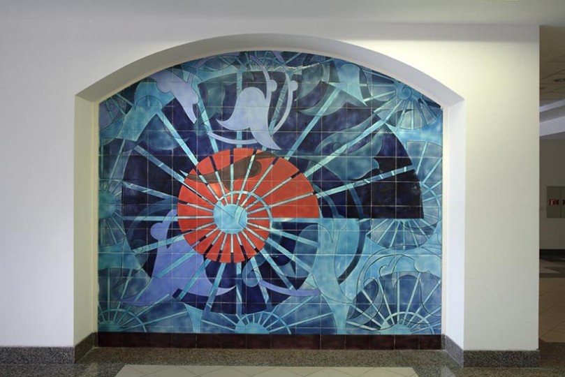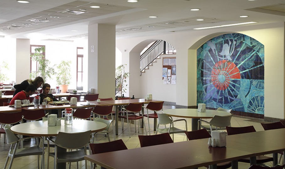 Koç Üniversitesi Sarıyer Yerleşkesi’nin yemek salonuna klasik rumi deseni sitilize edilip 1/50 oranında büyütüldü ve bu görsele Koç Üniversitesi logosu eklenerek özel bir tasarım hazırlandı.
