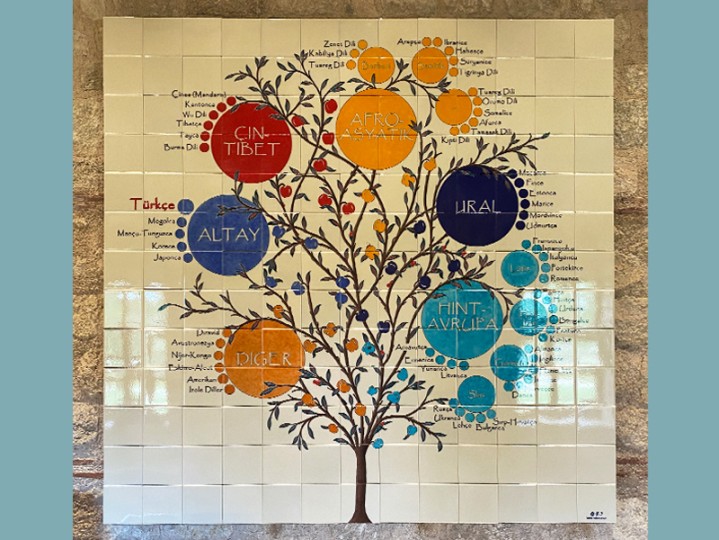 Rami Kütüphanesi’nde sergilenen dil soyağacı temalı çini pano, dünya dillerinin kökenlerini ve dil aileleri arasındaki ilişkileri sanatsal bir anlatımla sunar. Geleneksel çini sanatı ile hazırlanan bu özel eser, Hint-Avrupa, Afro-Asyatik ve Ural-Altay gibi dil ailelerini görselleştirerek ziyaretçilere kültürel bir keşif deneyimi yaşatır.